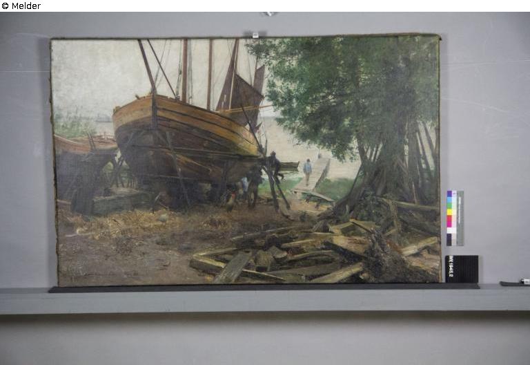 The open-air painting shows the outside area of a shipyard on the banks of the Elbe near Finkenwerder. Several men are working on a damaged sailing boat. A densely leafy tree on the right shades their workplace. Numerous planks of wood are leaning against the trunk, and other pieces of wood have been placed next to it in a disorganised manner. A chicken is pecking in the sawdust that forms a soft, flat cushion around the boat. A rooster standing close by seems to be attentively observing the viewer of the picture. In the background, a short footbridge leads onto the water. Back: top left on frame: number "182" circled in pencil, right side of frame: "Heumann" in pencil, bottom right: Inv. no. old stock: "AB1401" in red chalk and as grey sticker.