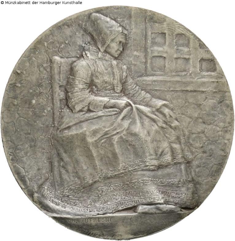 Obverse: Breton fisherwoman in costume and headdress sitting on a chair to the right, in the background part of a window, below the signature CH. DUFRESNE; reverse: Column with crucifix, Mary and John in front of the open sea; border: cornucopia ARGENT hallmark 31
