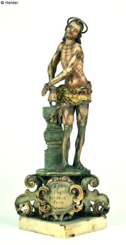 Sculpture made of alabaster. A polygonal pedestal rises on a square plate placed over a corner, with openwork volutes curved outwards on both sides. In the middle oval cartouche framed by palmettes and volutes. The slender figure of Christ is marked by the torments experienced with left standing leg and right playing leg, the left hip bent out, the upper body turned to the left, the head tilted to the right. The crossed hands are fixed with ropes to a baluster-shaped, square flagellum column. Frame: Incarnate of Christ brownish, eyes blue, hair dark blond; palmettes of the base and the cartouche as well as the loincloth gilded; base and column grey, base dark green. On the cartouche in ink: Ego in Flagella potatus sum Psal XXX VII F XVIV; signed on the reverse: A H