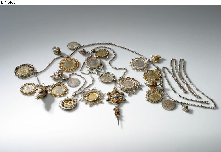 Chain with strong round links at one end ring with hallmark (unclear) possibly Rosenberg vol. I, 311. Plug with flat, broadly curved head; on the front plate with gilded sheet metal base, on top latticework of gilded filigree, decorated with rosettes of colorful cut glass stones and small sky-blue stones, in the middle glass pearl, in between bridges of small glass pearls. Flat intermediate element, triple bent out, decoration similar as before, upper and lower spirals of silver wire, short square plug tapered downwards.