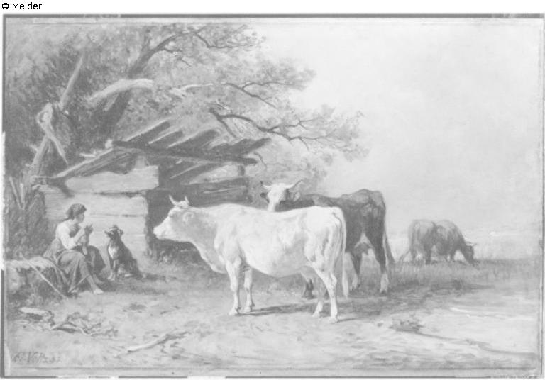 In the foreground a light-coloured and a brown cow looking to the left. On the left a knitting girl in a red skirt and yellow bodice sits with a dog in front of a rotten wooden hut. Behind it some trees. Towards the back right another cow drinking from a lake.