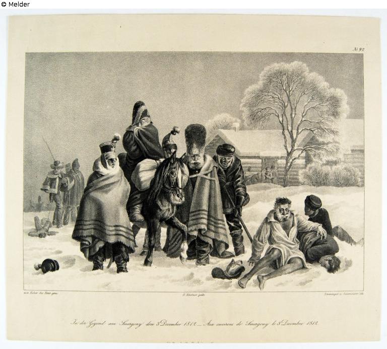 Found-Object Report | Object report In der Gegend von Smergony den 3. Dezember 1813 Lost Art-ID579154 Previous Next Artist / Creator Emminger, Eberhard Birth 1808.10.16, Biberach an der Riß Death 1885.11.25, Biberach an der Riß Place of activityBiberach an der Riß; München; Stuttgart; Rom TitleIn der Gegend von Smergony den 3. Dezember 1813 Dating1801/1899Object typePrintGroup of reported objectsGraphicMaterial / TechniquePaper / printed (lithography)MeasuresBlatt: 26,5 cm x 30,4 cm Height 19.30 cm Width 27.50 cm Inventory numberA 1945-195Holding Erwerbungen für das sogenannte Führermuseum in LinzProvenance Unknown origin; probably acquired for the "Sonderauftrag Linz" Read more Read less Published since10.09.2018 Contact Staatliche Kunstsammlungen Dresden Kupferstich-Kabinett Taschenberg 2 01067 Dresden Germany Phone(0351) 4914 3210E-Mailkk@skd.museumHomepagehttps://www.skd.museum Contact DirektionPhone(0351) 4914 3210E-Mailkk@skd.museum
