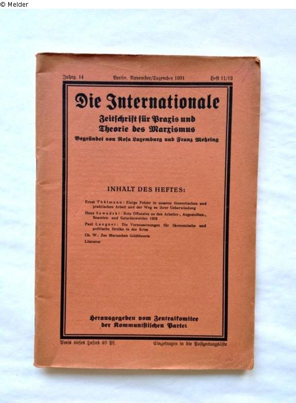 Found-Object Report | Object report Die Internationale (Jg. 14, Heft 11/12). Zeitschrift für Praxis und Theorie des Marxismus. Begründet von Rosa Luxemburg und Franz Mehring Lost Art-ID520848 Previous Next Author Zentralkomitee der Kommunistischen Partei (Hg.) TitleDie Internationale (Jg. 14, Heft 11/12). Zeitschrift für Praxis und Theorie des Marxismus. Begründet von Rosa Luxemburg und Franz MehringPlace of releaseBerlin Date of publication1931Object typeBookGroup of reported objectsLibrary objectsSignatureo.Nr.Description handschr. Vermerke auf Titelblatt, stark verblasst, oben rechts: "2 Gr." [roter Stift], unten rechts: "1 Stück" [roter Stift] Read more Read less Provenance unknown Read more Read less Published since11.08.2014 Contact Provenienzforschung, Hausarchiv, Bibliothek Potsdam-Museum - Forum für Kunst und Geschichte Am Alten Markt 9 14467 Potsdam Germany Phone+49(0)331 - 289 6821Fax+49(0)331 - 289 6808E-Mailmuseum-geschichte@rathaus.potsdam.deHomepagehttp://www.potsdam.de/potsdam-museum