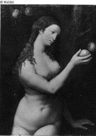 Found-Object Report | Object report Eve Lost Art-ID220301 Previous Next Artist / Creator Floris, Frans (1) Birth 1516, Antwerpen Death 1570.10.01, Antwerpen Place of activityRom TitleEve Dating1559Object typePaintingGroup of reported objectsPaintingMaterial / TechniqueOil ; Panel / painted Height 97.50 cm Width 76.50 cm Inventory numbermü5416Description Signiert und datiert: F(?) F 1559; Unter Apfelbaum weibl. Halbakt nach rechts, in erhobenen Rechten Apfel, stützt sich mit der Linken auf. Read more Read less Holding Kulturgüter aus dem ehemaligen ReichsvermögenPublished since2001 Contact Kunstverwaltung des Bundes Herbert-Bayer-Straße 5 13086 Berlin Germany E-Mailprovenienzforschung@kvdb.bund.deHomepagehttp://www.kunstverwaltung.bund.de