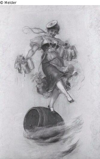 Auf einem rollenden Faß Kellnerin mit Maßkrügen in der Hand, rechtes Bein nach vorn. Nach halblinks aus dem Bilde sehend. Signatur: bez. auf dem Faß: F.A.K.