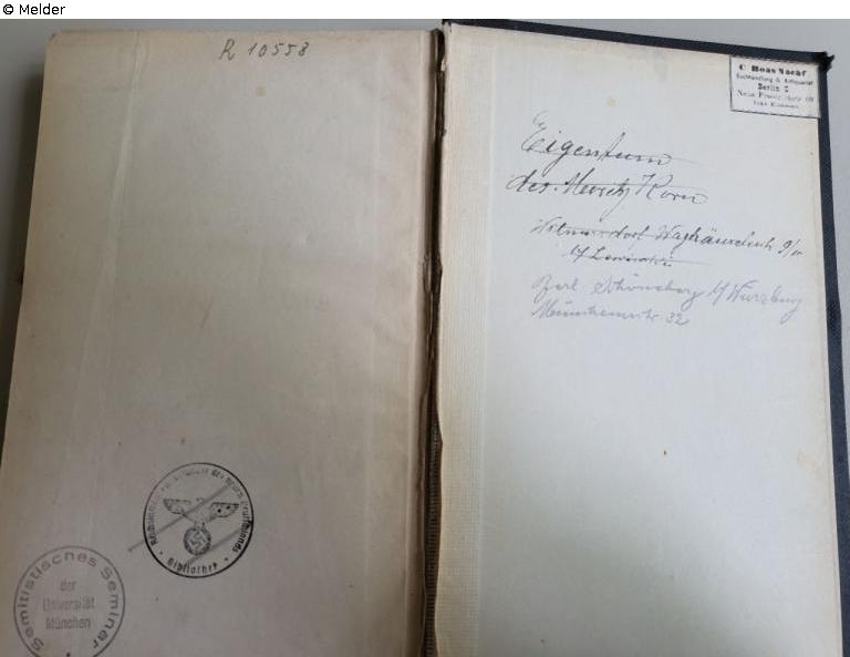 Handwritten ownership entry: "Eigentum des Moritz Korn, Wilmersdorf, … Würzburg." (According to the Central Database of Shoah Victims' Names at the Yad Vashem memorial, Moritz Korn was born on 3 June 1871 in Konitz (Poland). He lived in Berlin during the Second World War and was deported to Riga (Latvia) on 19 January 1942, where he was murdered).
