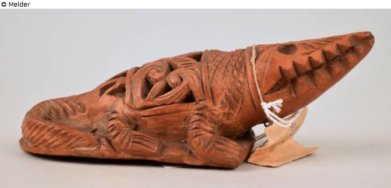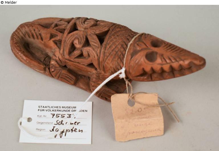 Egyptian figure in the shape of a crocodile, grater for removing cornea; probably Russian number on the neck, unidentifiable old label