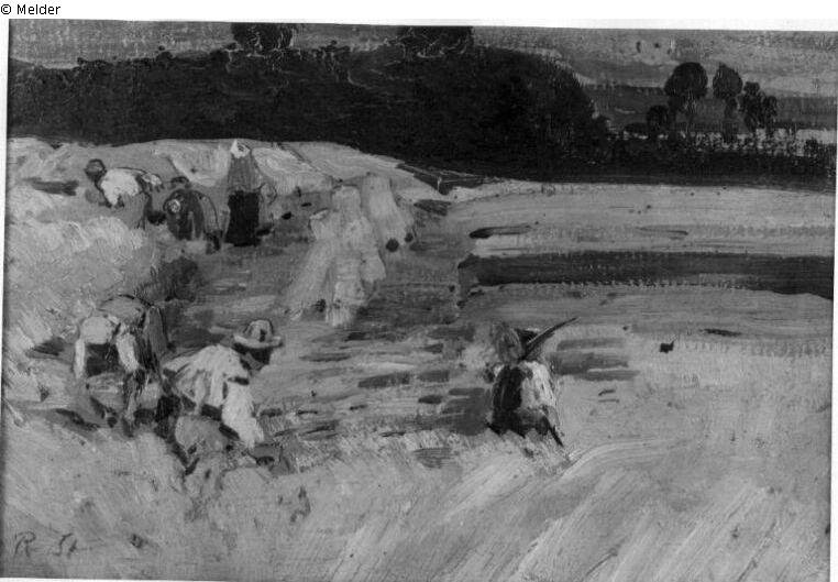 Signatur: R. St.; Vorn Mäher, rechts und links Frauen, links weitere Bauerngruppe. Im Hintergrund Wald.