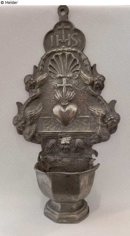 Small holy water font for wall mounting; above the font is a flaming heart with a cross, above that a shell framed by five cherubs; above, below the mounting, "IHS" with a cross.