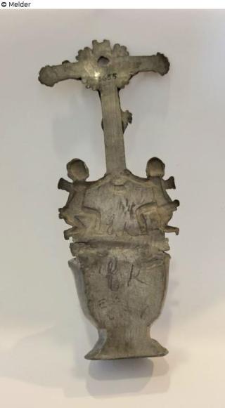 Small holy water font for wall mounting; above the font, two cherubs beneath a crucifix with Christ crucified; between the cherubs a heart, above it a skull and crossbones; inscription on the reverse in pencil: E.K. (twice), inscription scratched into the reverse: Johann Colo[...] (?), scratched out several times