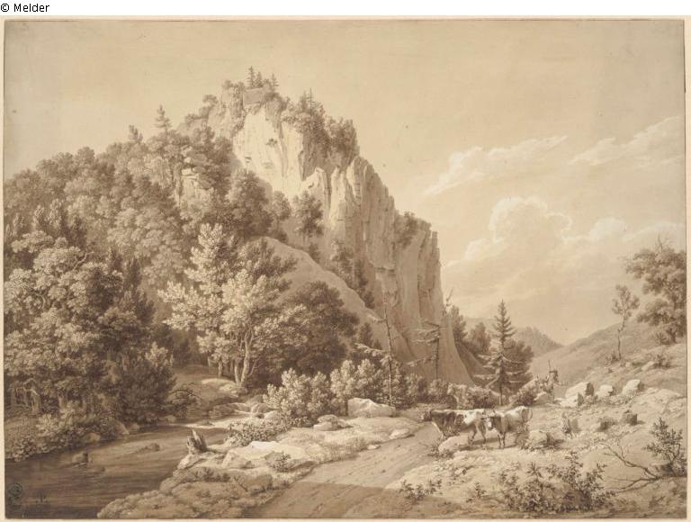 Landscape with a big rock at a river, on the right a herdsman driving his cows