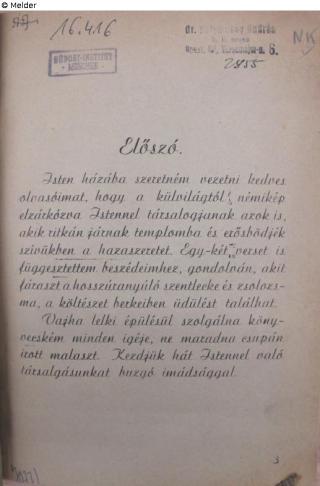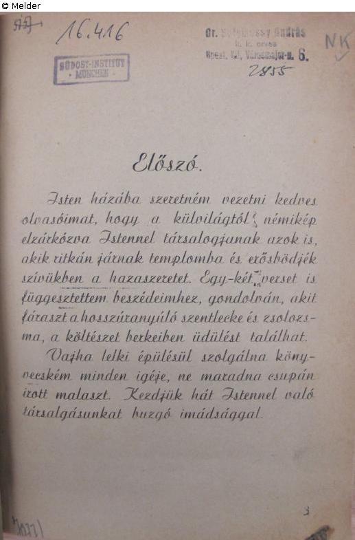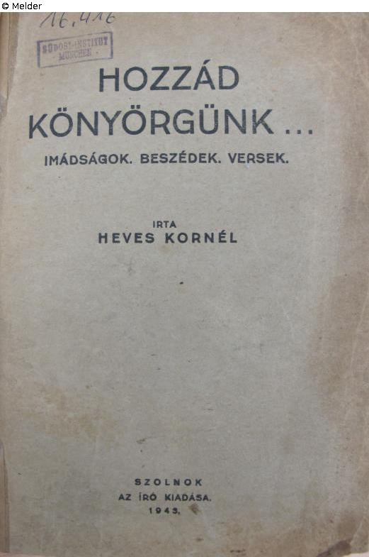 Found-Object Report | Object report Hozzád könyörgünk … imádságok. Beszédek. Versek. Lost Art-ID623475 Previous Next Author Kornél Heves Publisher Selbstverlag TitleHozzád könyörgünk … imádságok. Beszédek. Versek.Place of releaseSzolnok Date of publication1943Object typeBookGroup of reported objectsLibrary objectsSignatureW 02/16.416Description 8°, on page with introduction name stamp of the doctor András Selymessy (?) from Budapest Read more Read less Provenance Suspicion of looted property, 1984 Südost-Institut Munich (Michael Schwartz estate) Read more Read less Status restituted Published since08.10.2024 Contact Leibniz-Institut für Ost- und Südosteuropaforschung Bibliothek Landshuter Str. 4 93047 Regensburg Germany Homepagehttps://leibniz-ios.de/bibliothek/ueber-die-bibliothek Contact Tillmann Tegeler, M. A.PositionArbeitsbereich Bibliothek und elektronische Forschungsinfrastruktur Leiter des ArbeitsbereichsE-Mailtegeler@ios-regensburg.de