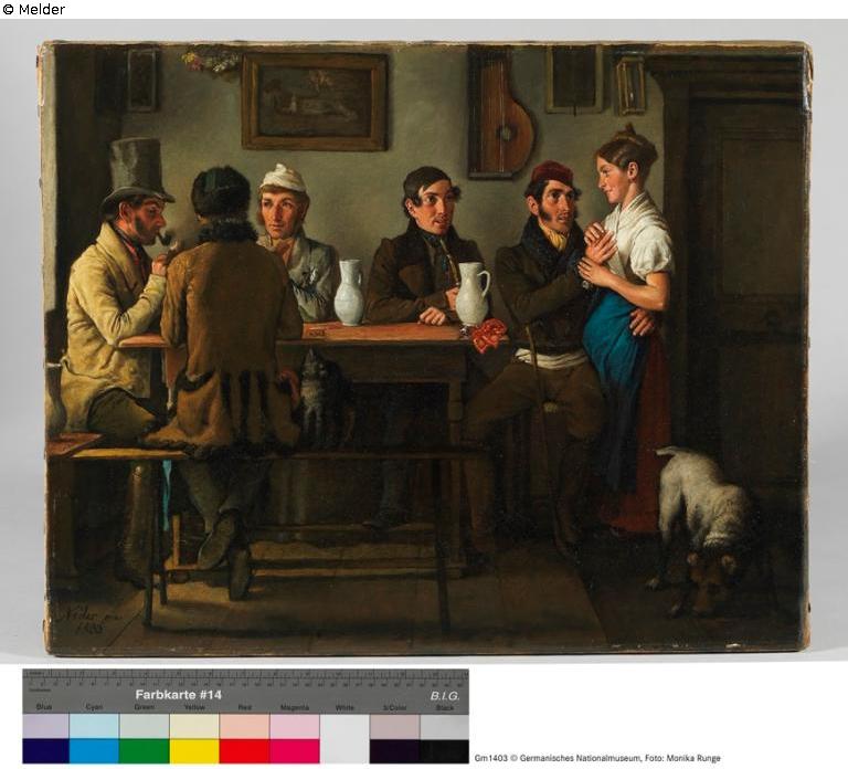 Neder is one of the first folk painters and portraitist of the rural bourgeois milieus. Compared to the idyllic depiction of the rural population typical of the Biedermeier, he reproduces his motifs illusionless and brittle. The unforgiving lecture of his host-house scene is barren to any romanticizing or moralizing intention, and outlines its outward appearance in the painting of the time. Signature: Neder pinx 1833 - Neder pinx 1833.