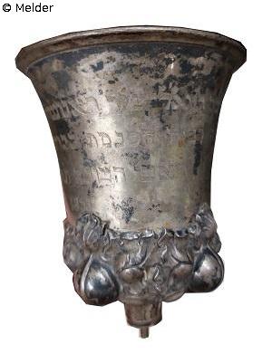 Bell-shaped upper part/cup of a silver goblet, gilded on the inside. The rim is folded. The wall engraved with the year and a Hebrew inscription. Outside with four-part relief: Rocailles, balls etc. In the centre is a screw for the missing lower part.