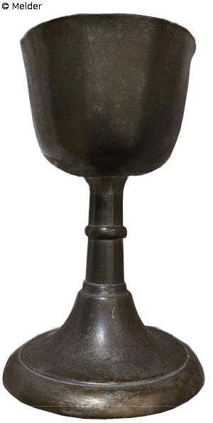 Simple pewter goblet with a goblet-shaped cup. The stem is decorated with a bead. The foot is curved upwards with a small step towards the rim and a slight double step towards the stem. No marks present. The rim of the cup is bent. The foot on the rim is dented. Repairs to the transition from chalice to stem.
