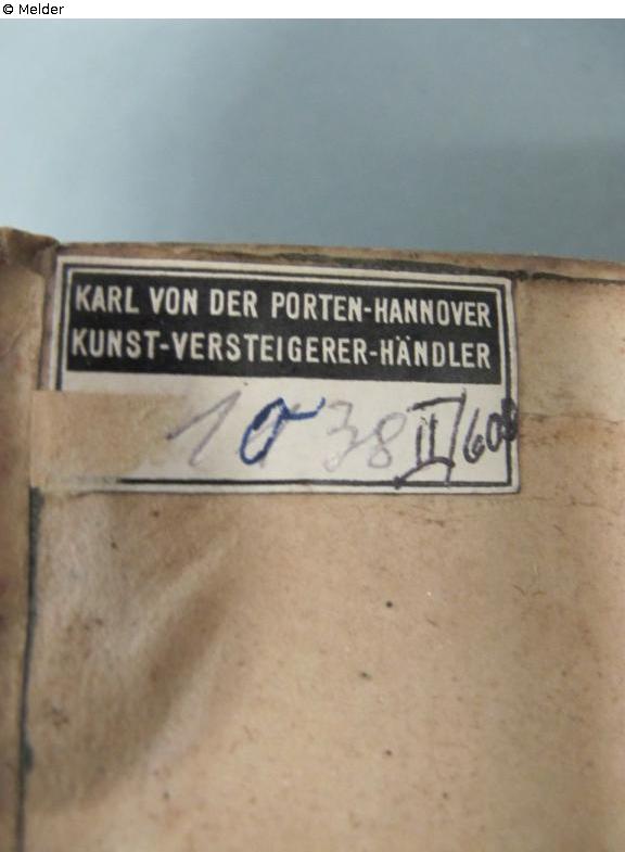 on pastedown lable Karl von der Porten-Hannover | Kunst-Versteigerer-Händler, with handwritten entry in pencil and ink on the lable: 10 38 II / 60[8?]; on half-titel in brown: ex libris Matth[..]j [?] Rashij [?]