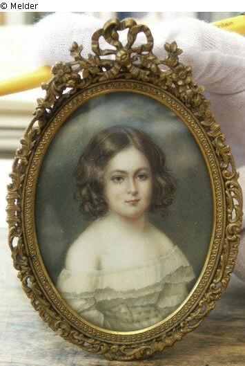 Elfenbeinmalerei mit Messingrahmen; Mädchenbildnis in weißem Kleid; unsigniert