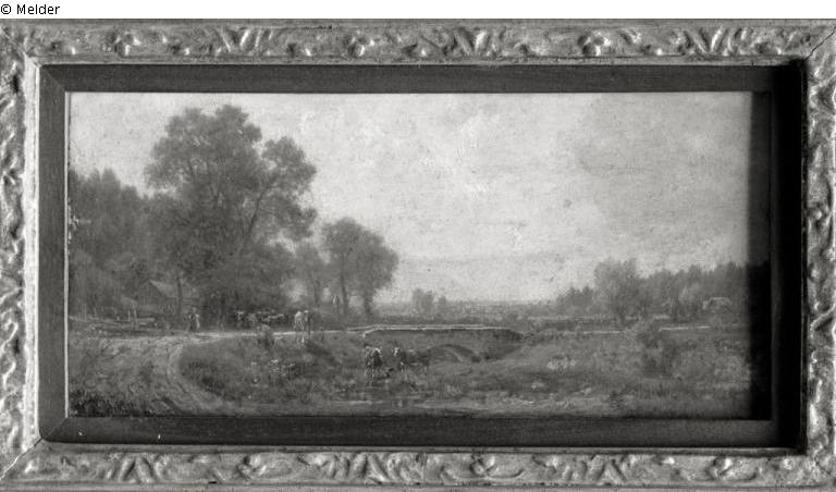 Picture referred to the lower left "L. Sckell" at the bottom of the frame free paper with "551" on the left rear side protection label BStGS "Inv.Nr. 14187", right next to it adhesive note with handwritten note: "Hst 257 Schell/ Landschaft mit Vieh" [Behind position BStGS], on decorative frame small bills in pencil