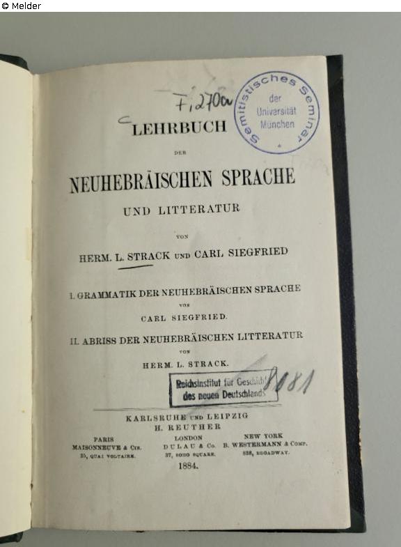 Found-Object Report | Object report Lehrbuch der neuhebräischen Sprache Lost Art-ID632693 Previous Next Author Strack, H./Siegfried, C. Publisher Reuther TitleLehrbuch der neuhebräischen SprachePlace of releaseParis u. a. Date of publication1884Object typeBookGroup of reported objectsLibrary objectsSignature1207/Fi 270aDescription stamp "Reichsinstitut für Geschichte des neuen Deutschlands" (A267/8081 ). Read more Read less Published since28.10.2025 Contact Ludwig-Maximilians-Universität Institut für den Nahen und Mittleren Osten Bibliothek Veterinärstr. 1 80539 München Germany Phone0049-89-2180-3039Homepagehttps://www.naher-osten.uni-muenchen.de/institut/bibliothek/index.html Contact Prof. Dr. Ronny VollandtPositionProfessor für JudaistikE-Mailronny.vollandt@lmu.de