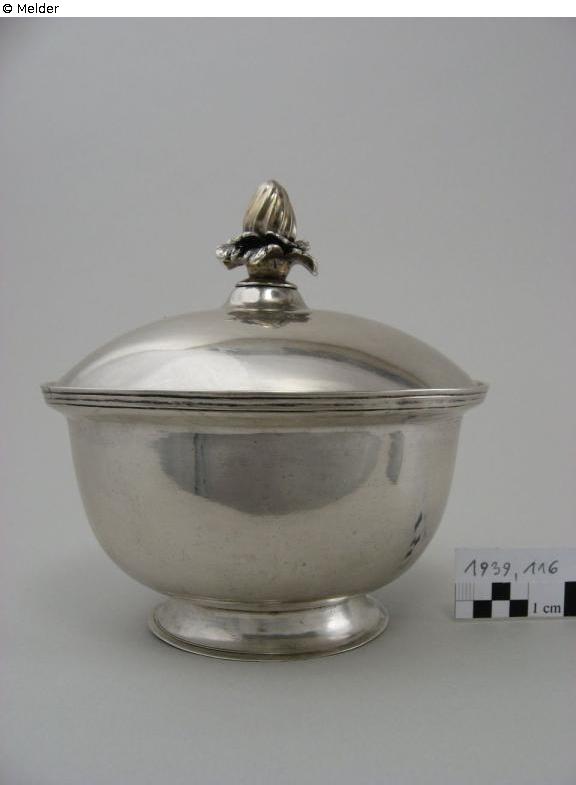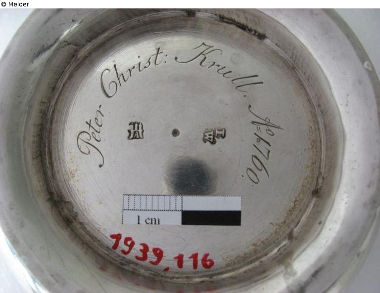 The round, smooth lid of the vessel is domed and moulded with a depression at the edge. A fully sculpted bud with a double wreath of leaves forms the lid knob. The bowl also has an engraving: "Peter Christ: Krull. A=o 1760".