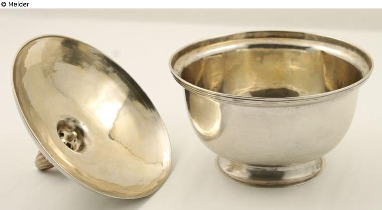 The silver vessel with matching lid has a smooth-walled, hemispherical body. The slightly flared body rim with an almost vertical, low edge is engraved with three superimposed lines. The body rests on a low base with a smooth moulding. The edge of the foot is set off by a double engraved line.