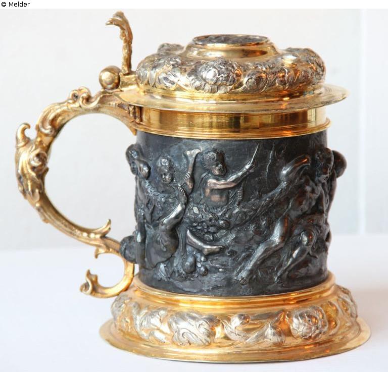 The partially gilded silver tankard has a cylindrical body decorated with a half relief of putti and floral festoons. The domed, round foot with the flared stand ring features a decorative strip in floral relief all round.