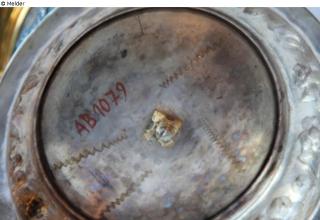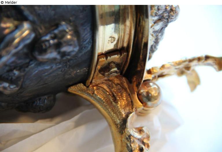 The vessel is closed by a domed lid with a flared rim. The bead is decorated with floral relief. The lid was attached to the top of the S-shaped handle of the hump with a hinge. The handle and split thumb rest are worked in cartilage moulds. The letters "OAS" are incised twice under the base, as well as the inventory number "AB 1079" and four jagged lines. The master's mark and the hallmark are located on the lip rim.