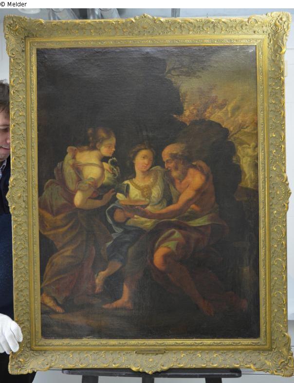 Illustration of the biblical scene Lot and his daughters in front of a rocky landscape; gilded, carved wooden frame; reverse handwritten on the outer frame pencil note "M L L,." or "MU,-"; as the left-center; top left, upside down "Frye" or "Fuge" "72 96 5" (probably indicating of the dimensions); on the frame illegible remnants of marks and residues of adhesive tape; on the sticker of collection Goudstikker: "Ciro Ferri, Collectie Goudstikker, Amsterdam, Kalverstr. 73, No. 1593 [crossed out in red and red overwritten with:] CB 781 "; Traces of distant sticky notes on all four spars; Canvas upper right "N° 75"; Residues of adhesives or scratches or color patches; Canvas with galvanized nails rewound.