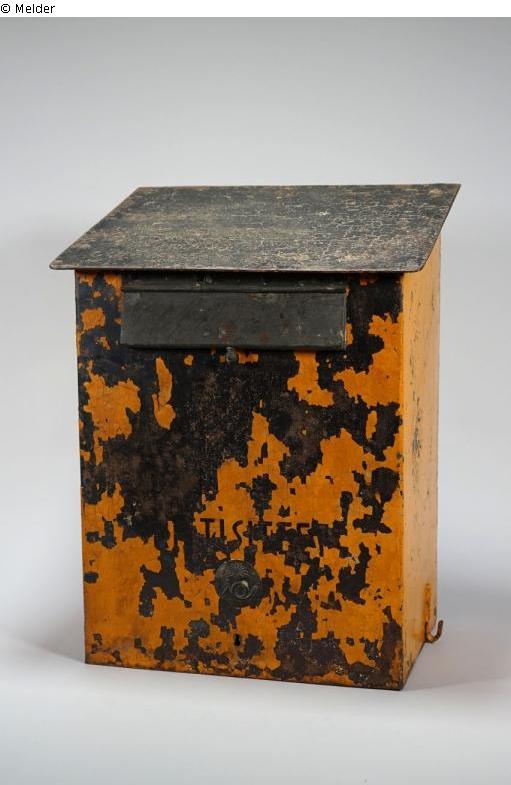 Large mailbox, simple design with single sloping roof, front insertion slot with heavy flap.