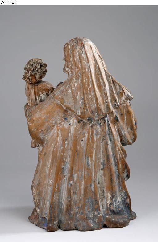 Full plastic group of reddish clay. On the left knee of the sitting Virgin Mary stands the blessing boy Jesus, whom she supports with her left hand, while her right hand reaches into the cloak lying on her lap. Mary with a girdled robe, headscarf and cloak with fringed hem.