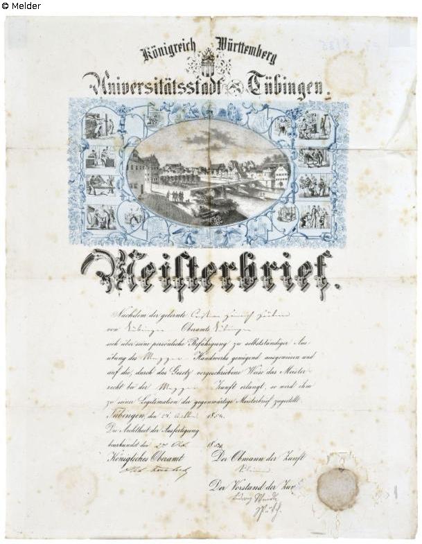 Master letter from butcher Christian Heinrich Härtner with view of Tübingen with the Neckar bridge