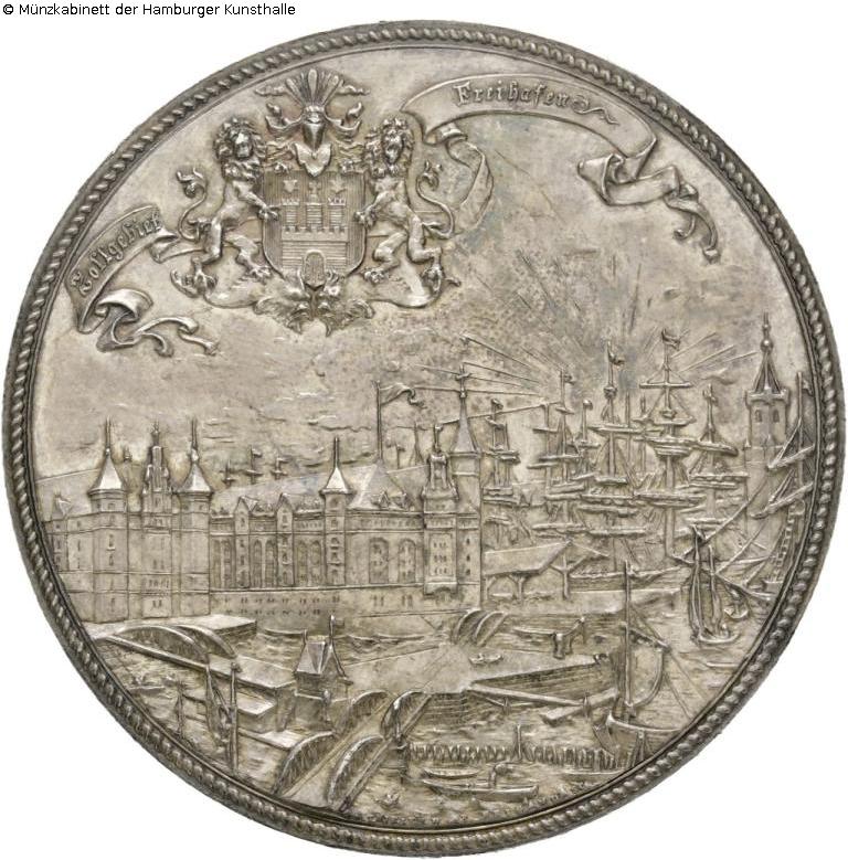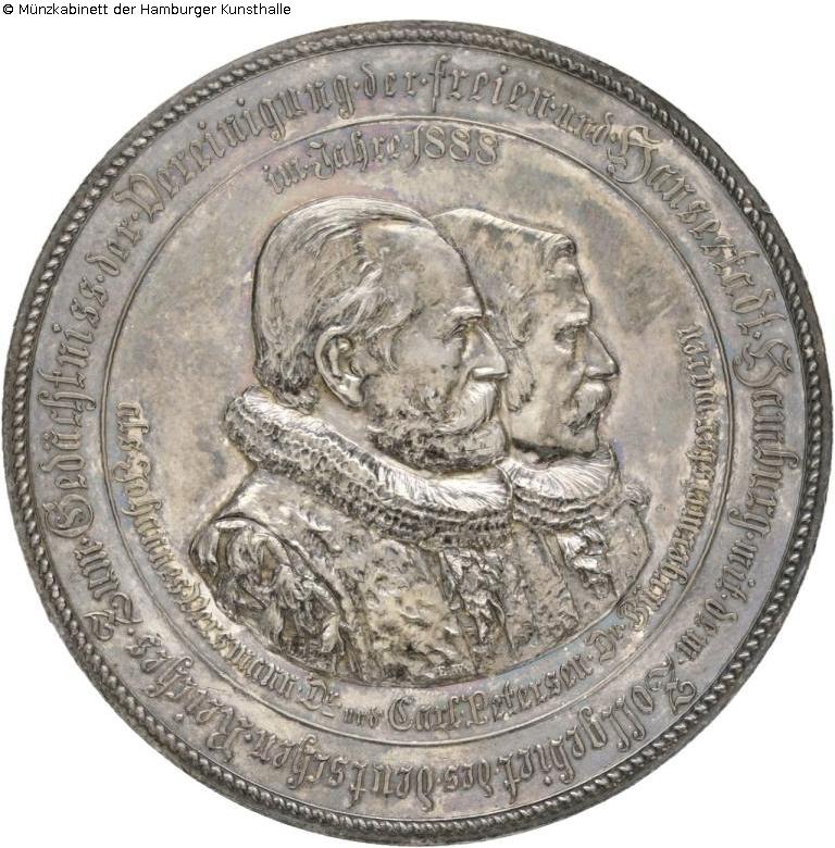 Obverse: Staggered bust portraits of Johannes Versmann and Carl Petersen in official robes to the right, legend: To commemorate the unification of the Free and Hanseatic City of Hamburg with the customs territory of the German Empire / in 1888 -/ when Johannes Versmann was Dr. and Carl Petersen was Dr. Mayor; reverse: view of Hamburg harbour with sailing ships over which the sun is rising. At the top left the helmeted coat of arms of Hamburg, held by two lions with shield banners, on it in Fraktur: Zollgebiet - Freihafen. At the bottom edge the signatures S THILEN D. E. WEIGAND SC.