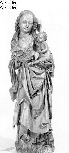 Probably Franconian work around 1500 from the school of T. Riemenschneider. Unmeasured. Mother of God standing in a rich pleated garment with headscarf and undergarments visible at the neck. In the right grape holding, on the left arm the baby Jesus. The baby Jesus naked with an apple in his left arm.
