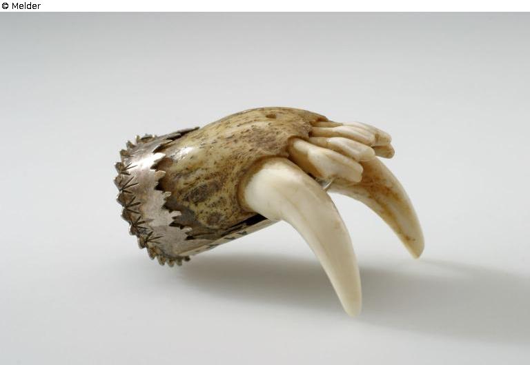 Predator teeth (marten or polecat), upper jaw with two canines, cylindrical silver frame. Bridge with Lambrequin border, tongue reaching to the teeth at the bottom; serrated plate with hanger.