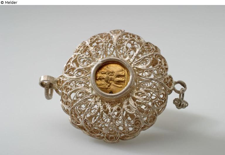 In the middle there is a cylinder which is closed by a small gold-plated medallion with a seated Maria and child. Wide double-sided filigree rim, the curved outer edges of which are connected. One ring each at the top and bottom, a small pendant at the bottom.