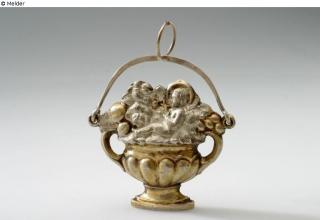 Pressed from two parts and soldered together. Double-legged footed vessel, containing roses and fruits between which the Christ Child with the cross in his hand lies. Movable hanger with ring. Handle with fineness stamp 13.