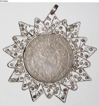 Laced pendant in the form of a silver Madonna Taler in star-shaped silver filigree setting with volutes and rolling mechanism. Mary sitting on the front with child, crown and sceptre, placing one foot on the crescent moon in her function as patron saint of Hungary, dated 1782. On the back two angels hold the winged Stephan's crown over the Hungarian coat of arms of Joseph II., surrounded by a chain of orders.