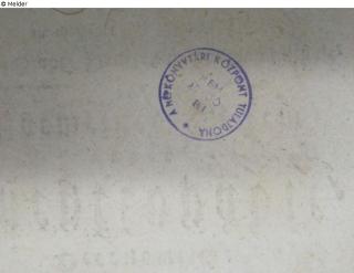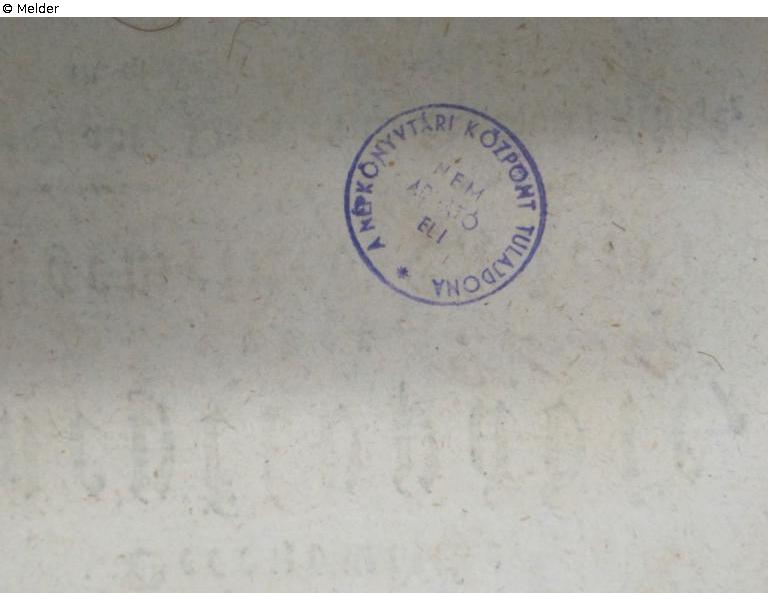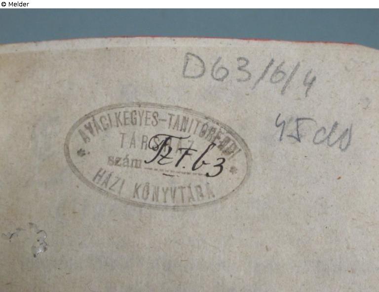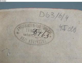 on the flyleaf with pencil: D63/6/4, 45 do; on the titlepage in black: Studii Philosophici Scholarum diarum; stamp on half-titel in brown, oval, 25 x 50 mm: A váci kegyes-Tanitórendi, Társhaz szám: [handwritten in brown] Tz fb 3 [?], Házi Könyvtá; verso on title-page a round stamp in blue, 20 mm: a népkonyvtári Központ tulajdona, nem adható el