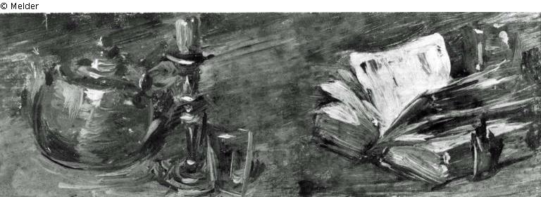 Motif: The narrow, landscape-format picture shows a bulbous red-brown jug, a tin candelabra with a burnt candle and a glass. On the right is a diagonally opened book with a second candlestick behind it. Work reference no. Gm 917 g