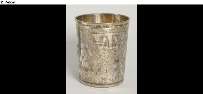 The small silver cup, which widens slightly upwards in a conical shape, has a lavishly engraved outer wall. The decoration shows an ornamental band with an acanthus tendril framed by double lines under a multi-profiled lip rim. Below this, engraved fruit festoons can be seen all around under draped ribbons with tassels. The foot of the cup is visually set off by a line.