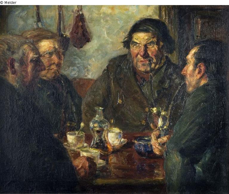 Four older men at a table, drinking coffee and smoking pipes