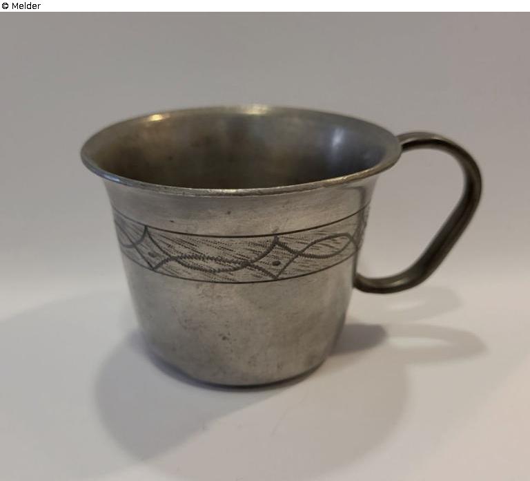Pewter cup with handle, decorated with tremolo lines around the rim, engraved with the letters "F. L." and underneath "[…]798" (possibly 1798), number "9634" scratched into the base.
