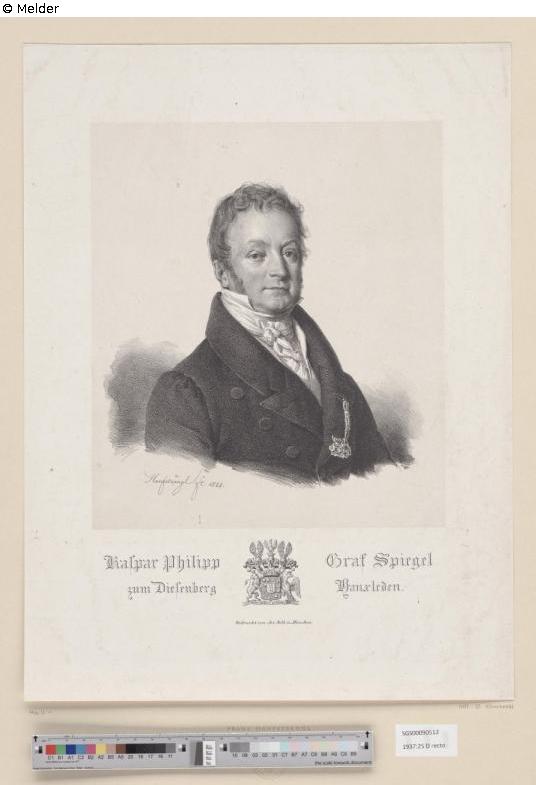 Recto: in the upper right corner, possibly originally written in pencil: "3", erased; signature in the stone, below the figure on the left: "Hanfstaengl ft. 1828"; Inscription printed below the image: "Kaspar Philipp Graf Spiegel / zum Diesenberg Hanxleden"; between the first name and surname, or between Diesenberg and Hanxleden, the family's alliance coat of arms is printed with two fields with three (2:1) round mirrors (coat of arms of the von Spiegel family) and two fields with the four-armed wall anchor of the von Hanxleden family; in the centre a coat of arms field with a two-tower complex (?) below the field the motto of the von Spiegel family "Mit Gott und mit Ehren" (With God and with honour), the coat of arms flanked by a crowned lion and eagle and crowned by the crests of the von Spiegel and von Hanxleden families, in the centre the crest with the imperial eagle; printed below the coat of arms: "“Gedruckt von Jos. Selb in München”' (Printed by Jos. Selb in Munich); verso: SGSM 18 / Lugt 1094c stamp in brown, with "1937" and "25" [inventory number SGSM] written in pencil; in the lower right corner, traces of pencil writing, cut off and therefore illegible;