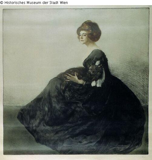 Full-length portrait: Lady in a dark dress with a wide skirt, sitting, a puppy on her lap; inscription at lower left: I.41/100, signed lower right: Stössel.