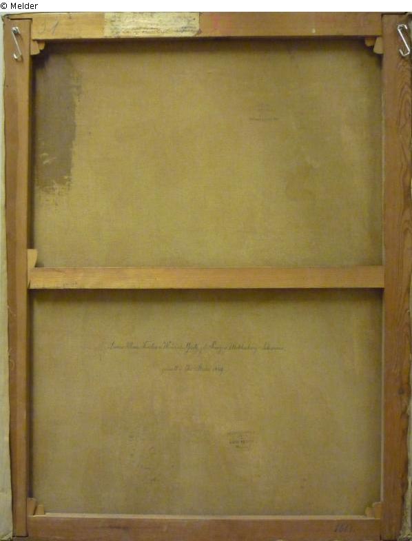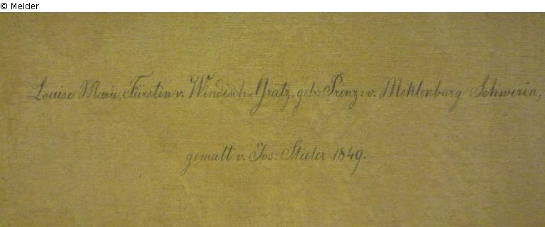 see G 2169; verso: picture carrier top stamp „[M]olerleinwand / Fabrik / von / A. SCHULZMANN / in / München“, bottom „Louise Marie, Fürstin v. Windisch-Grätz, geb. Prinz: v. Meklenburg Schwerin, / gemalt v. Jos: Stieler 1849.“, stamp