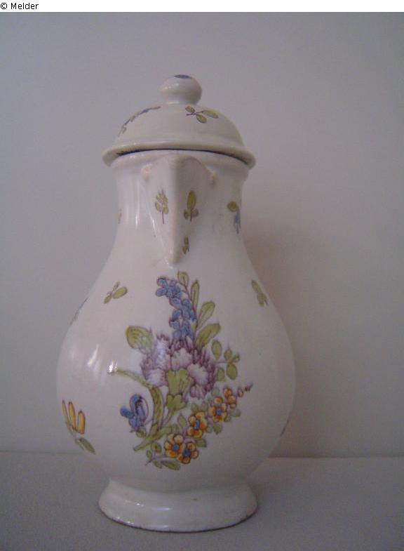 Dekor: sog. deutscher Blumendekor. Frontal auf der Kanne großes Bouquet mit Nelken, Glockenblumen und Vergissmeinnicht. Auf den Seiten zwei Veilchen bzw. Vergissmeinnicht (?) - gleiche Motive auch auf dem Deckel. Auf Deckel und Wandung weitere kleine Streublüten und -zweige. Der Deckelknauf ist mit einer Blüte versehen.