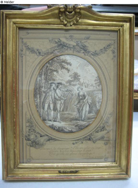 Pourquoy la chagriner? Elle est jolie et sage [...] (Vorlage für einen Illustrationsstich zur Komödie "Les Moissonneurs" von Charles Simon Favart)