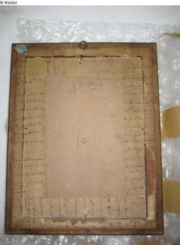 cardboard backing reinforced with handwritten, mostly illegible cut outs; upper centre, illegible inscription in pencil; inscribed in pencil: “No. 34”; inscribed in red: “57”; centre, inscribed in black: “17”