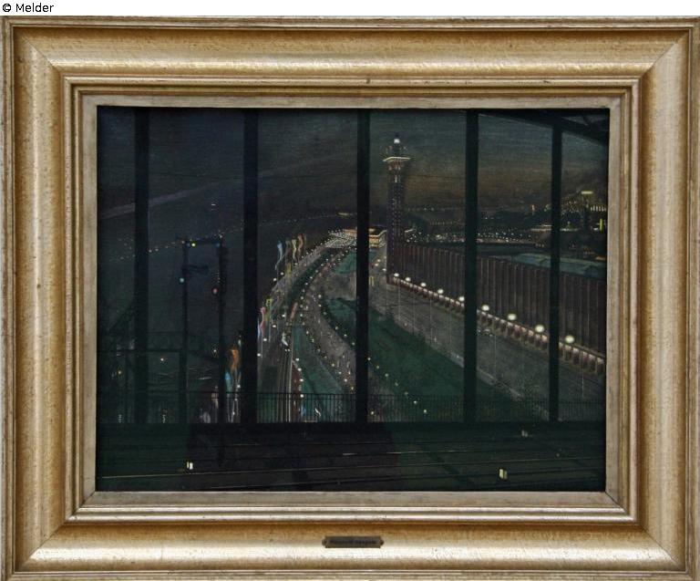 The picture shows a view of the "Pressa" (press exhibition) in Cologne in 1928 from the Hohenzollern Bridge. It is a night-time view of the new buildings erected for the exhibition and an impression of the city's still very modern lighting thanks to the supply of electricity.