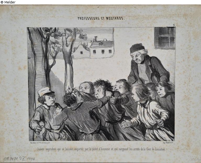Recto: above centre in stone "PROFESSEURS ET MOUTARDS., 9", below left in stone "843", monogram "h.D.", "Jeunes imprudens qui se laissent emporter par le point d'honneur et qui narguent les arrets de la Cour de Cassation" below left in pencil "No 2421, D V 1446" below right in pencil "47/1948"; verso: below left in pencil "49359".